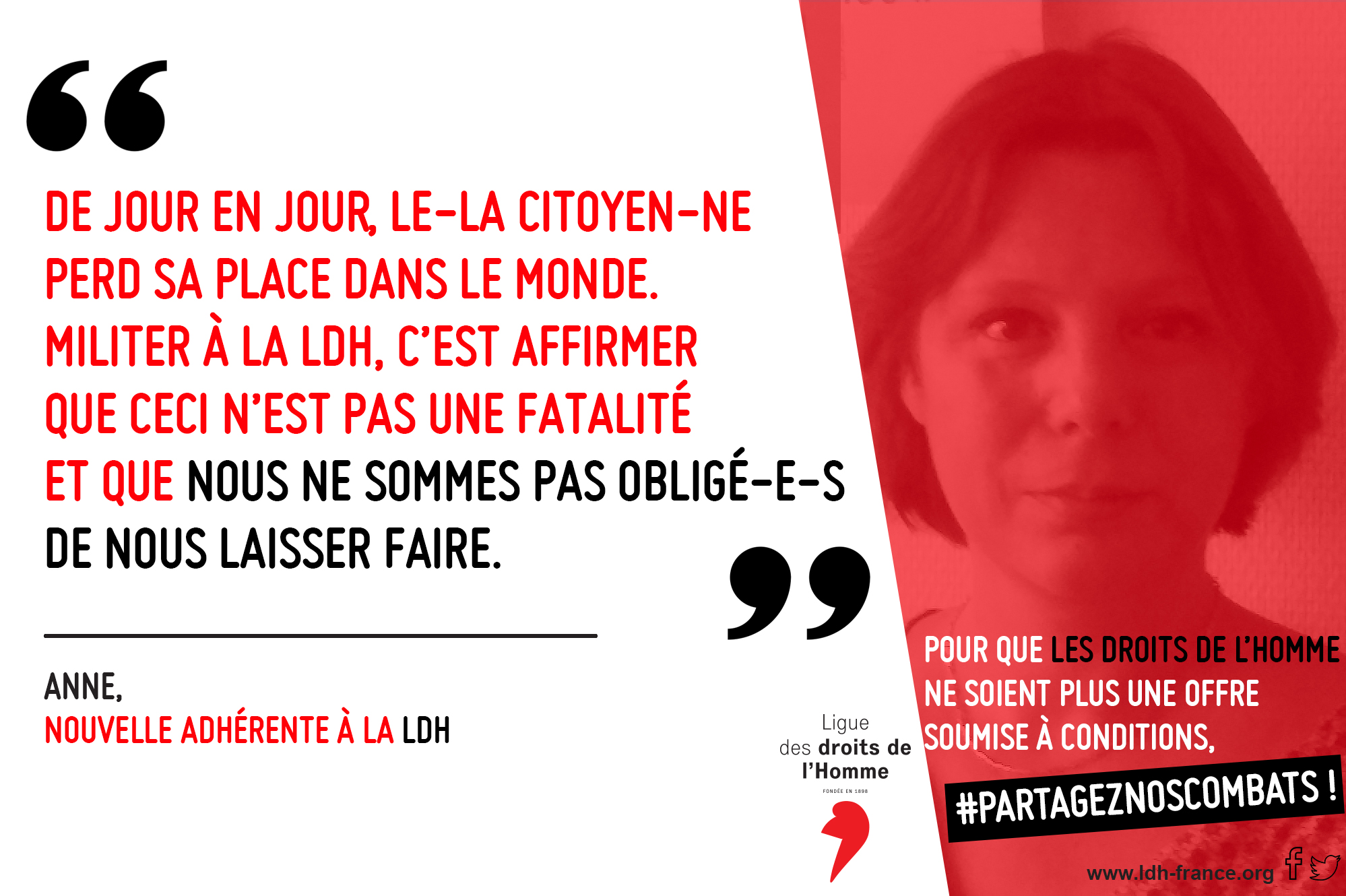D’où que l’on vienne, où que l’on soit né·e, notre pays s’appelle Solidarité « Nous n’allons pas combattre le racisme par le racisme, mais grâce à la solidarité. » (Fred Hampton, Black Panthers Party – mai 1969). Notre pays construit des ponts pas des murs. D’où que l’on vienne, où que l’on soit né·e, notre pays existe. Il s’appelle Solidarité. Notre pays n’a ni carte, ni limites. Il ne fait pas la guerre si ce n’est au fascisme, au racisme, à l’injustice et aux inégalités. Notre pays n’existe pas isolé, atomisé, soumis. Il existe dans tout ce qui relie, regroupe, donne confiance et lutte. Mais notre pays est en danger et nous appelons à la mobilisation générale.
