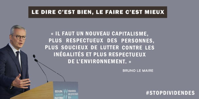 Les paroles, c’est bien… On passe aux actes ? Pour la transformation de notre économie, pour l’interdiction du versement par les entreprises de dividendes, les rachats d’actions et bonus aux PDG. C’est une question de justice et de solidarité nationale.